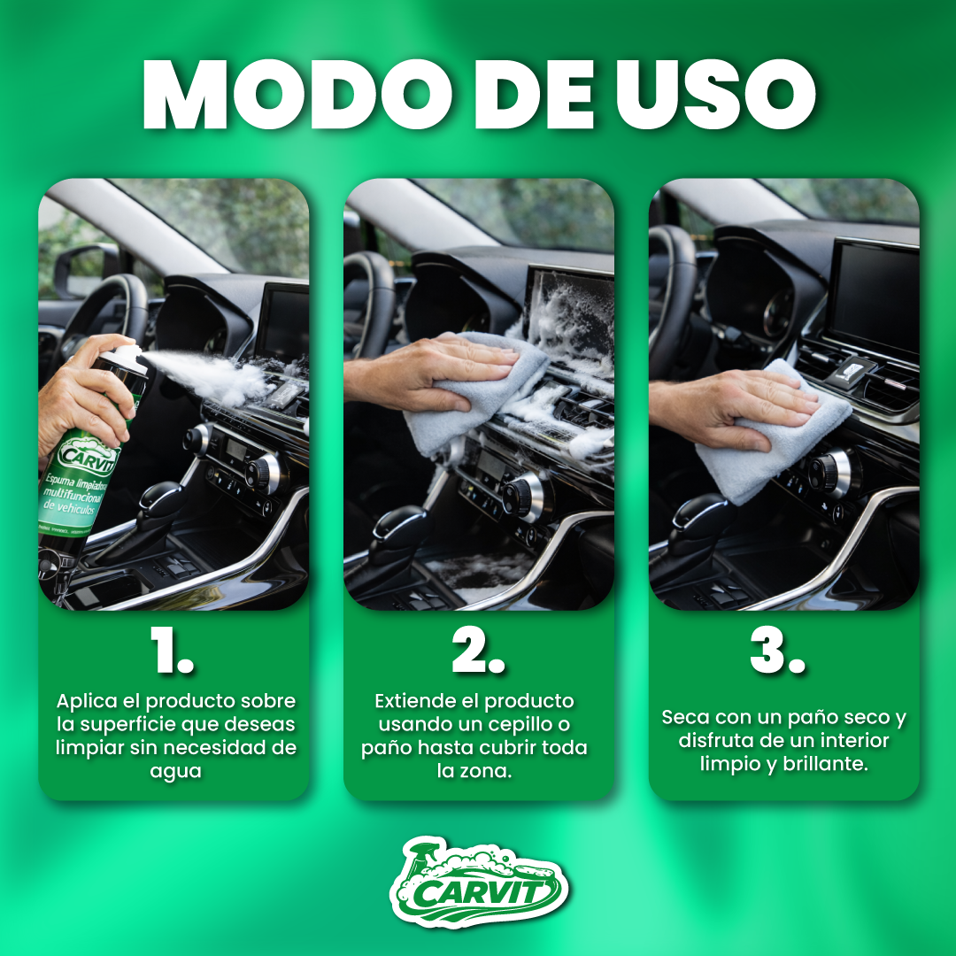 Si estás cansado de ver asientos manchados, el tablero opaco y las puertas llenas de mugre, todo eso desaparece con Carvit. Ahora limpiarás tu auto por dentro, eliminando la grasa, suciedad y polvo sin esfuerzo.